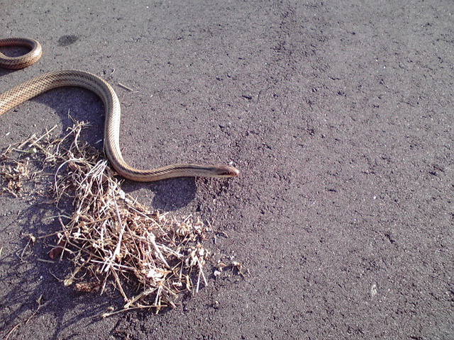 5,6分位しただろうか。のそのそとヘビが動き出した。で、そのときに撮ったのが上の写真。アスファルトの上を這うヘビは、斜めに移動するのだ。最初はすぐに追いつけるほどの速度だったんだけど、やがて早足じゃないと追いつかない速度になってしまった。そのうち社屋の影に隠れてしまった。まぁ十分楽しませてもらったよ。ありがとよニョロ蔵、また会う日まで。ニョロ蔵自身は命からがらなんだろうけど。それにしてもヘビの皮って、ひんやりしてすごいツルツルなんだね。ヘビ革製品の肌触りと一緒。