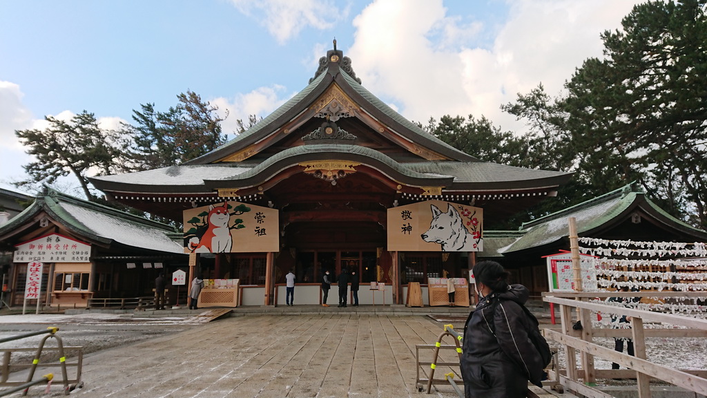途中吹雪に見舞われるも、神社の駐車場に到着する頃には、青空が広がっていました。