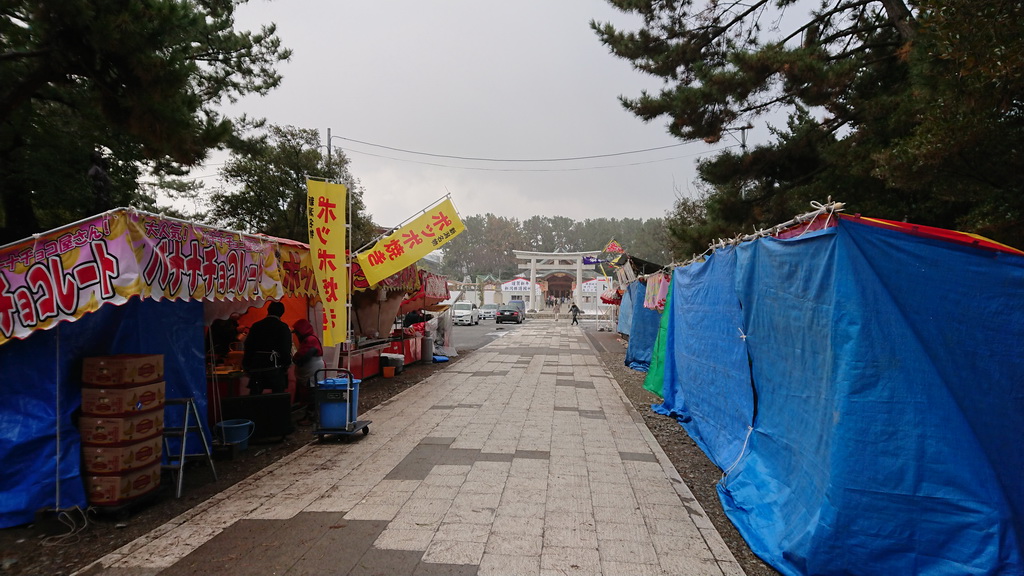 お参りを終え駐車場に向かっていると、参道沿いの屋台が開店準備をしていました。
