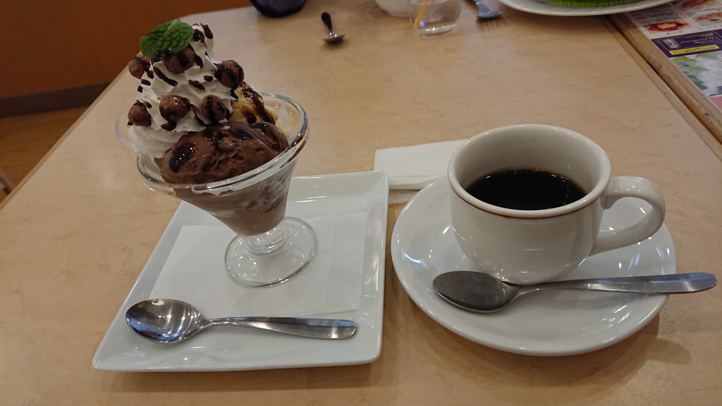 ファミレスなんて久しぶりなんで、サンデーとコーヒーをオーダー。
